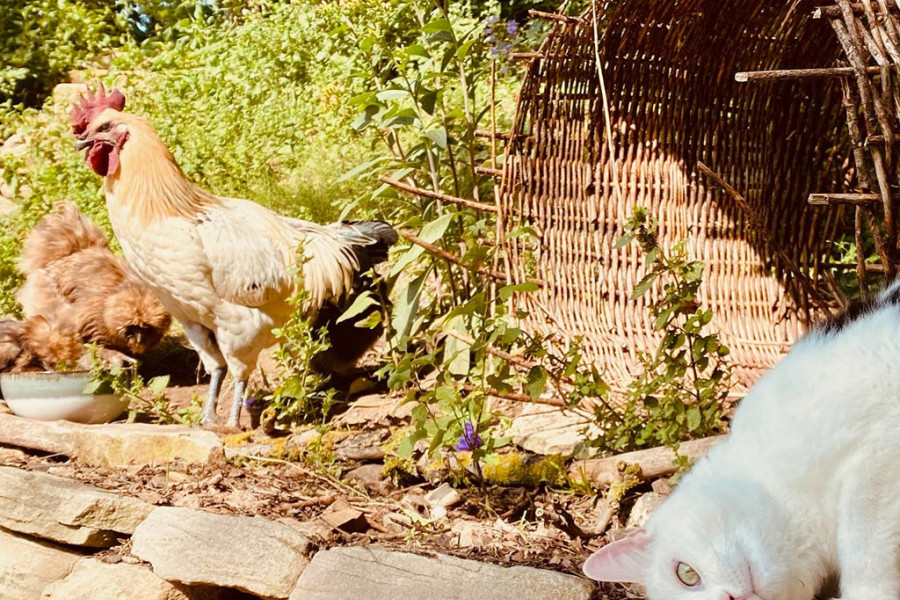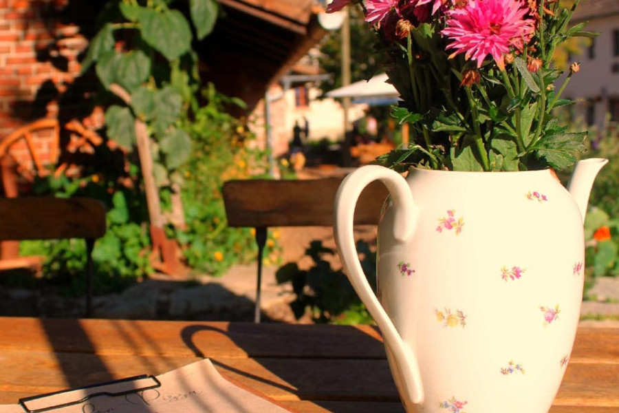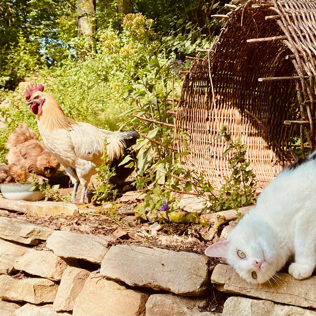 Egal wohin man schaut: Schmetterlinge über den Beeten, Libellen am Wasser, Bienen im Lavendel – und immer mal wieder kommt ein Huhn vorbei. Die lassen sich gerne füttern, Futter gibt's am Tresen. So süß. Und an warmen Juniabenden? Glühwürmchen. Kleine, lautlose Lichter im Garten. Man sieht sie nicht jede Nacht – aber wenn, vergisst man es nicht.